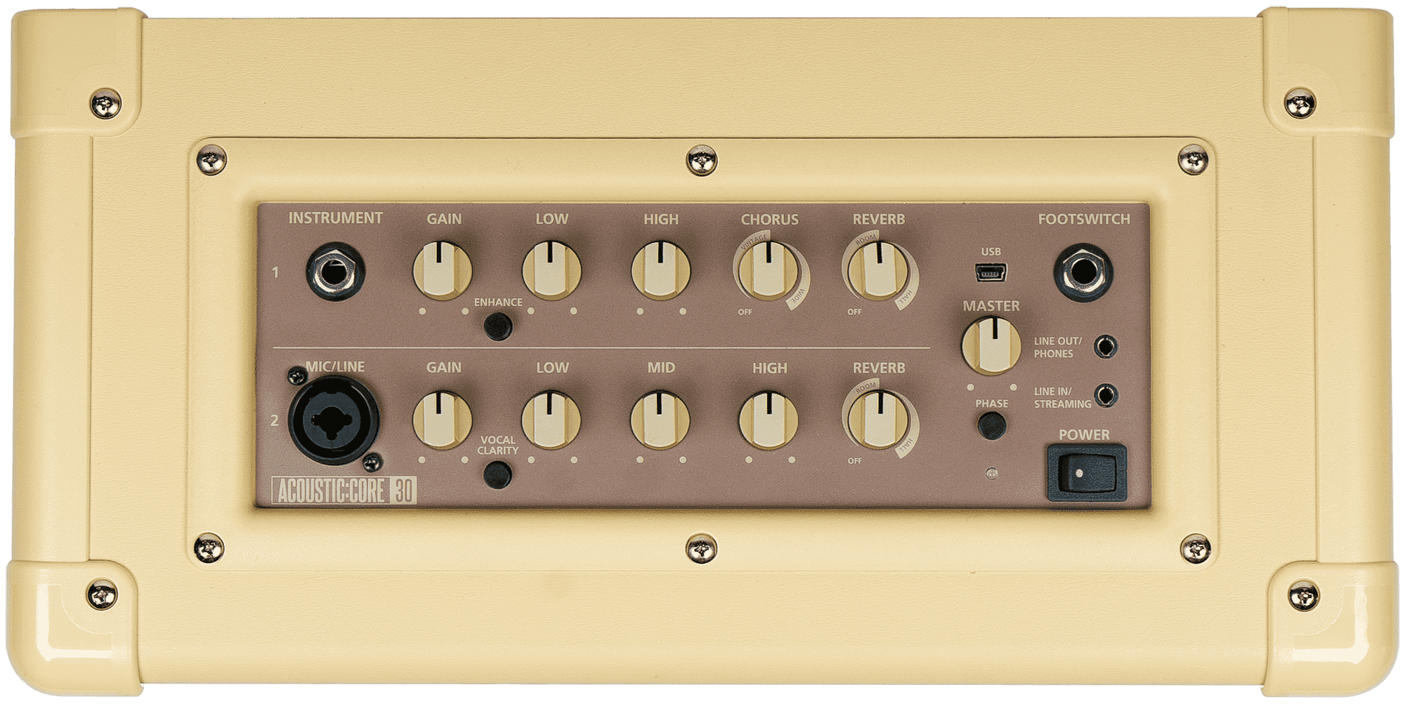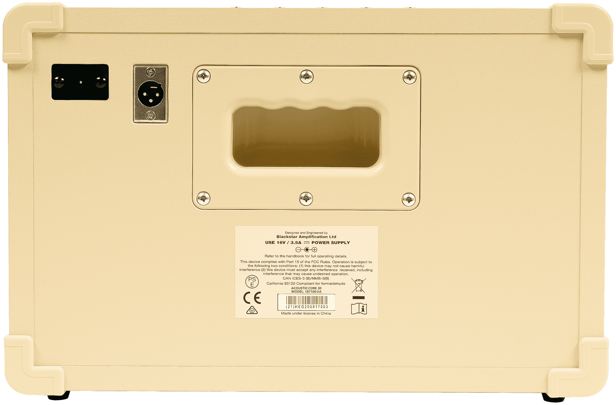 - Eingänge: 6,3 mm Klinke (Kanal 1), Combobuchse (Kanal 2), 3,5 mm Klinke (Aux-In)