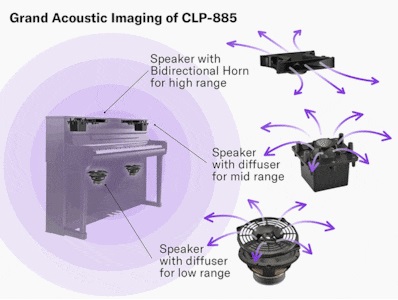 Die Platzierung, Ausrichtung und Lautstärkebalance der Lautsprecher in den tiefen, mittleren und hohen Frequenzbereichen der CLP-800-Serie wurde optimiert, basierend auf einer detaillierten Analyse der Klänge, die von den Komponenten eines Flügels abgestrahlt werden, sowie deren Ausbreitung von den Quellen weg. Zusätzlich wurden Diffusoren, Waveguides und bidirektionale Hörner implementiert, um den indirekten Schall, der von den Wänden reflektiert wird, zu nutzen und den Nachhall des Klangs zu verbessern. Diese Konstruktionsmerkmale reproduzieren den Nachhall und die Tiefe des natürlichen Klangs im umgebenden Raum und schaffen ein Klangfeld, das dem eines Flügels nahe kommt.